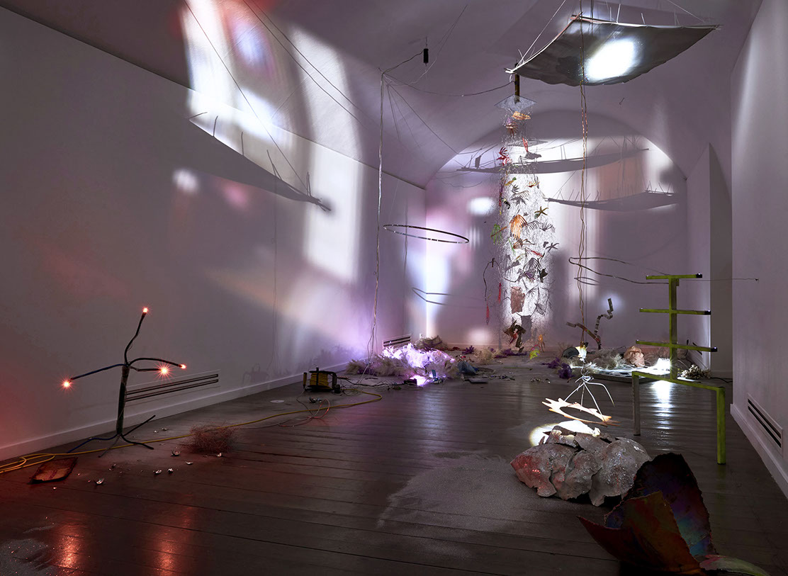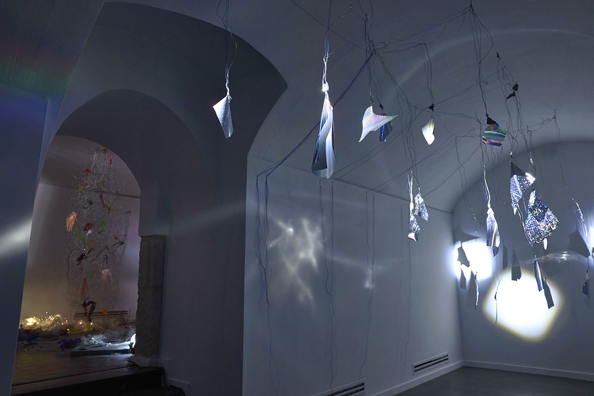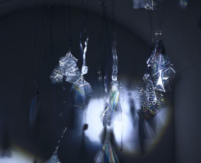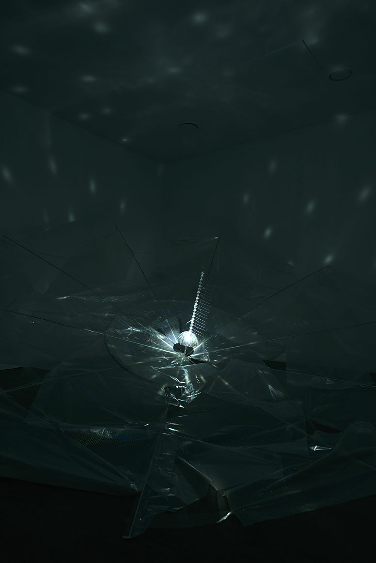 AYAAOEHO / glitter, metal mesh, small motors, plastic christmas tree, papier mache, industrial electrical wire, ikea table, coral reefs, holographic film, aluminum sticks, christmas bombs, led diods, video, planetarium projection / solo show / 2021