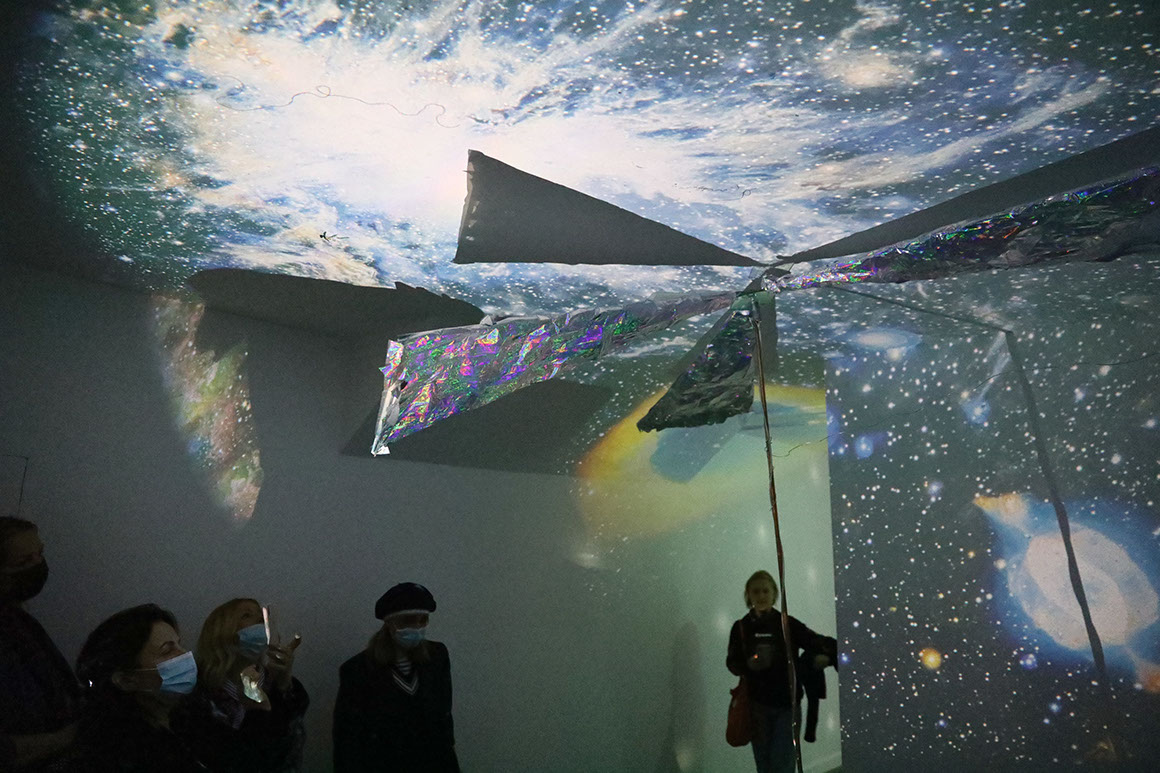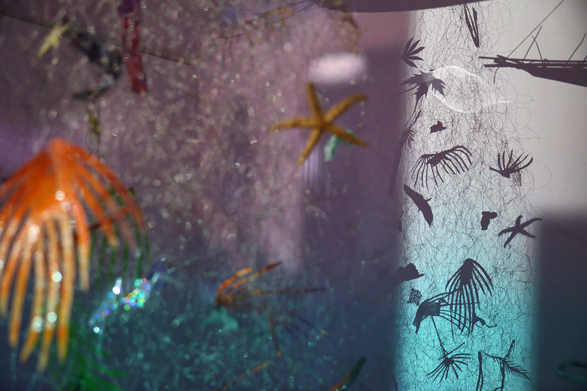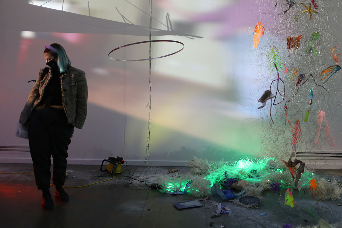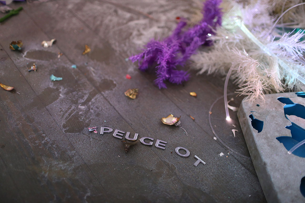 AYAAOEHO / glitter, metal mesh, small motors, plastic christmas tree, papier mache, industrial electrical wire, ikea table, coral reefs, holographic film, aluminum sticks, christmas bombs, led diods, video, planetarium projection / solo show / 2021