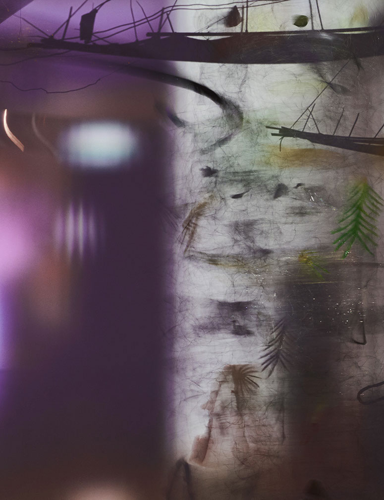 Aurora Borealis, a glistening rain of vibrant dust, a hurricane enclosed in a glass ball, an orbit on a stick, and a shattered galaxy. Monumental ferns and microscopic horsetails from the Devonian. Objects trembling, shaking, carried on an imaginary wind, disappear into the contour-erasing obsession. In a vertigo of hierarchic points. They copy and repeat. They taunt and tempt. Mosses as slick as sweepings. Mirroring light or just catching reflected glints. The aerial collects fog sounds, the twister gives off metallic noises, and the peculiar construction summons impending hurricanes. The show goes on. The plot unfolds in a crystal palace. A warm-house garden in miniature. Therein, as Sloterdijk would have it, the space – since time has long ceased to exist – elbows its way for ecstatic creatures, in whom the outside operates without end. That same outside attracted by a glass coating like a magnet, and the very same that will eventually break that ceiling. Like a palm that has grown out of too tight a conservatory. Or else. It has been outgrown.