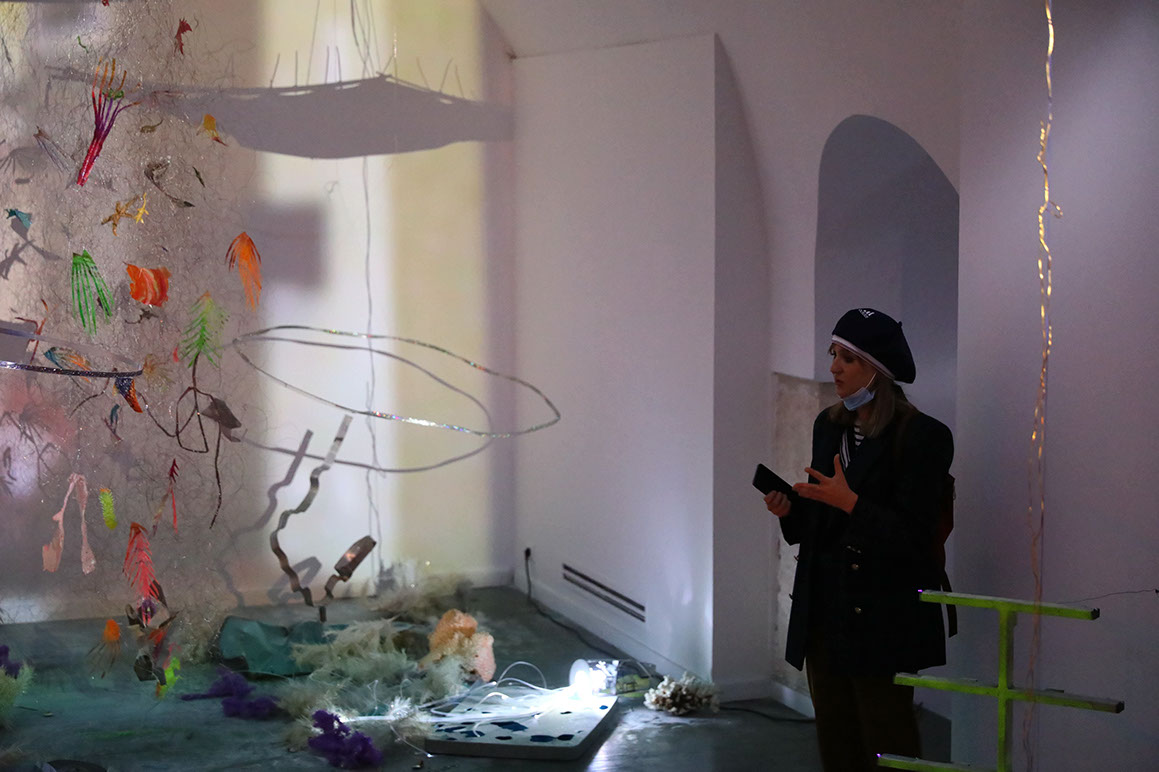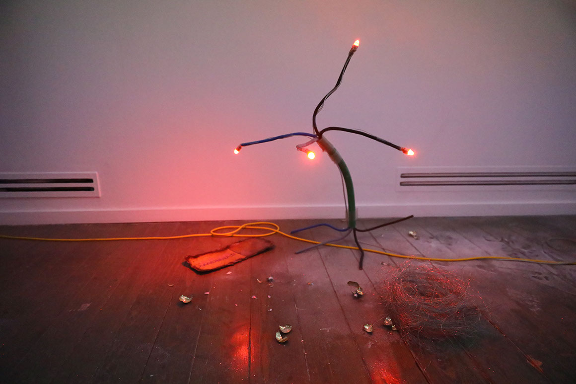 The gallery space is a five-room basement of a 13th century tenement house. Convoluted exhibition space is a kind of a landscape produced from found objects and waste materials. The environment is interactive, the sculptures are moving and making sounds, reacting on a person entering the space. Each object has its own choreography. In the main room I placed a blurred video projection of me dancing in my living room.