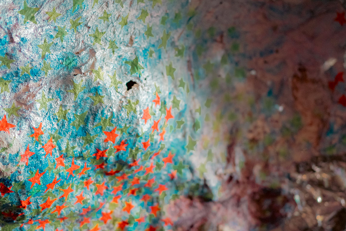 I dried the wood pulp on a several kinds of foil: brushed foil used for protecting wood, reinforced film for greenhouse glazing and smooth dust sheet. I wanted it to resemble a hill or a cave when it dried – depending on whether one viewed it from above or from below. I decorated it with stars cut out of fluorescent crêpe paper, gluing them close to one another. Finally, I would break the pulp into pieces: sometimes, this was necessary for transportation purposes; on other occasions, the pulp would crack under its own weight. It would be difficult to say whether the pattern represents a star cluster, sunset sky or the pulped flags of different countries and alliances.