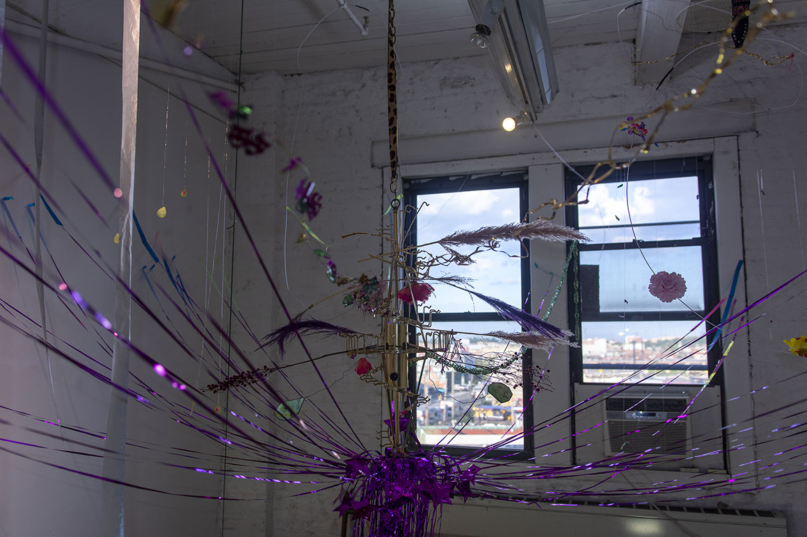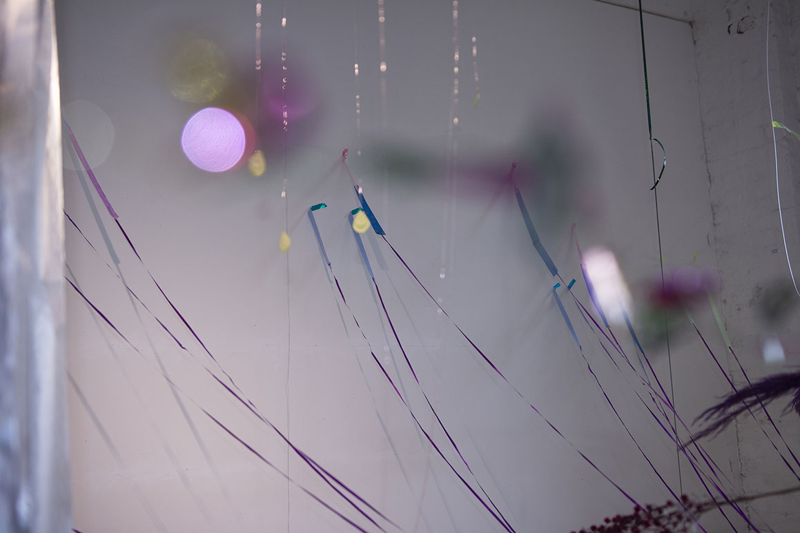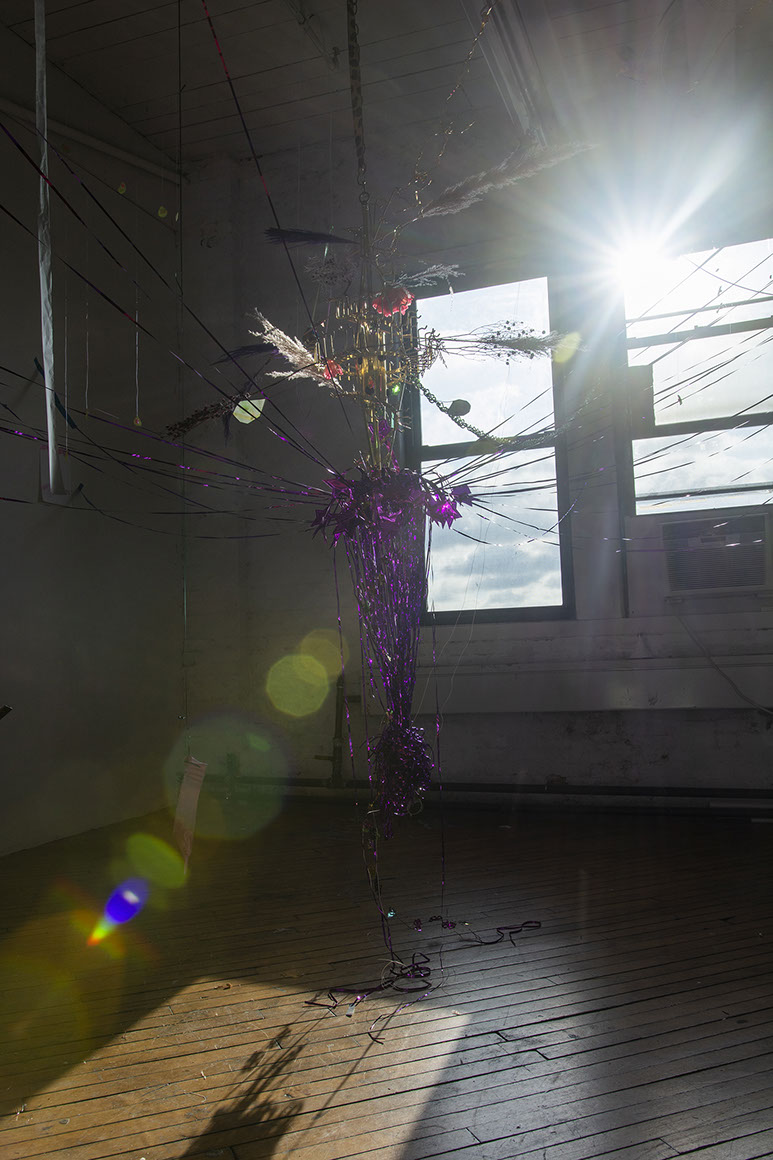 I place a found chandelier as the central point of my residency studio. The installation of delicate, lightweight objects seems to burst into space. Ribbons from the centre reach into each side of the room gently touching the walls with holographic tape. With one sweep of my arm I could blow it all down. The installation corresponds with the baroque and eclectic, highly detailed view from my residency window to industrial Brooklyn. Entering the installation requires an elaborate choreography of movements. Among the ribbons, I placed several mobiles that move objects at different speeds.