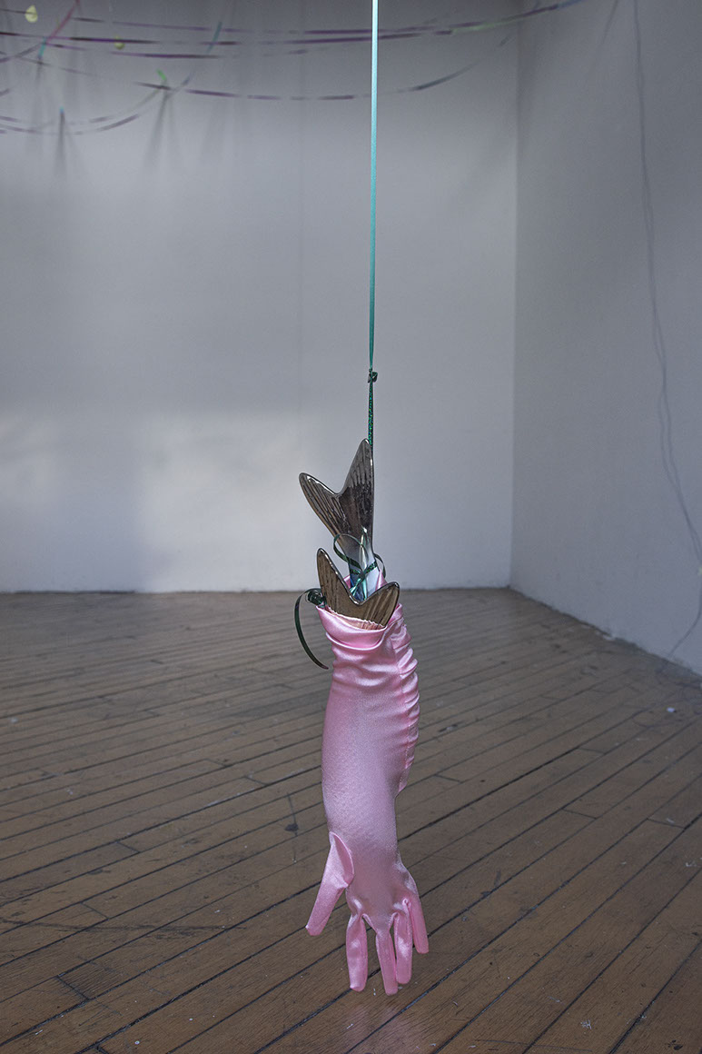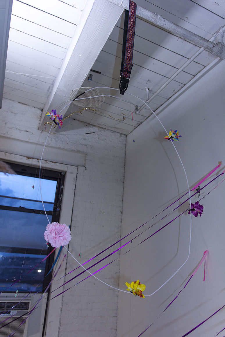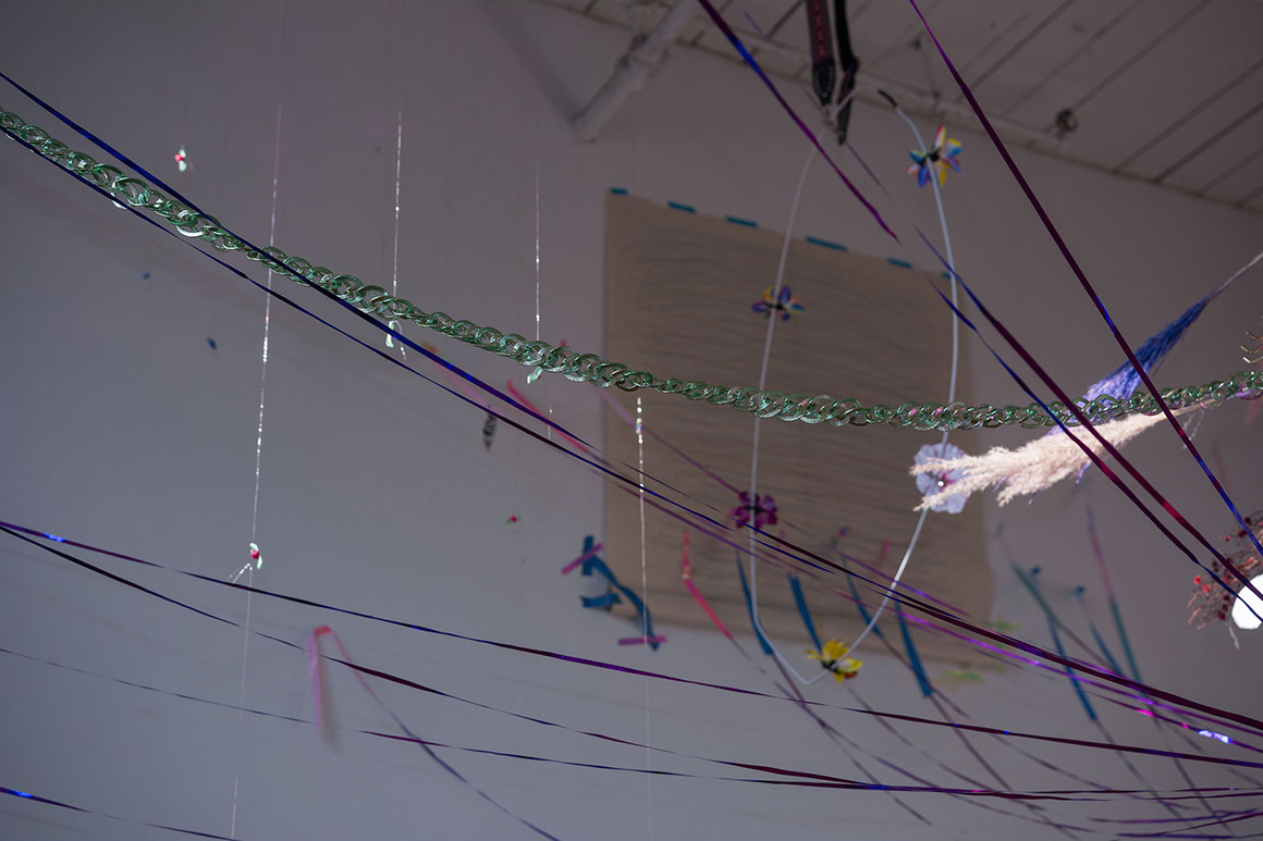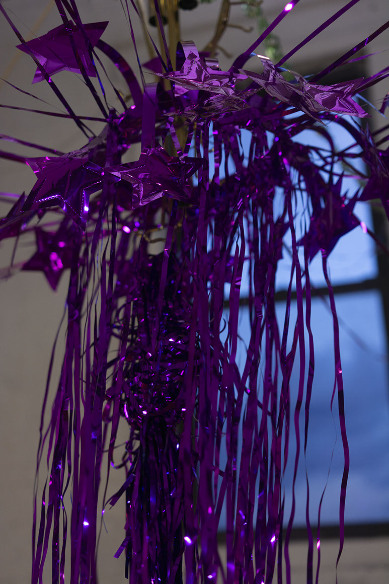 I place a found chandelier as the central point of my residency studio. The installation of delicate, lightweight objects seems to burst into space. Ribbons from the centre reach into each side of the room gently touching the walls with holographic tape. With one sweep of my arm I could blow it all down. The installation corresponds with the baroque and eclectic, highly detailed view from my residency window to industrial Brooklyn. Entering the installation requires an elaborate choreography of movements. Among the ribbons, I placed several mobiles that move objects at different speeds.