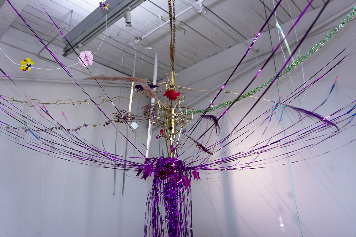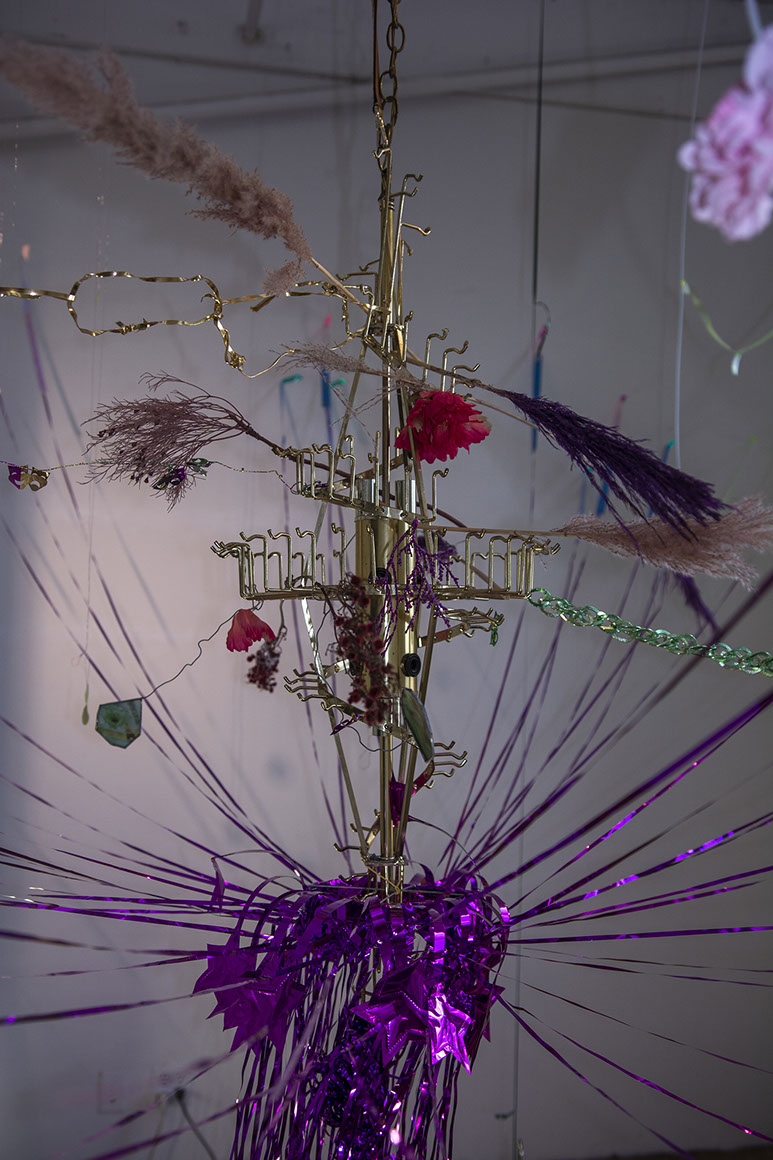 COMPOSITION TWO / chandelier, ribbons, leather belts, metal chains, plastic flowers, dry flowers, small motors, lenticular postcards, opalescent tape / 500x500x300cm / 2022