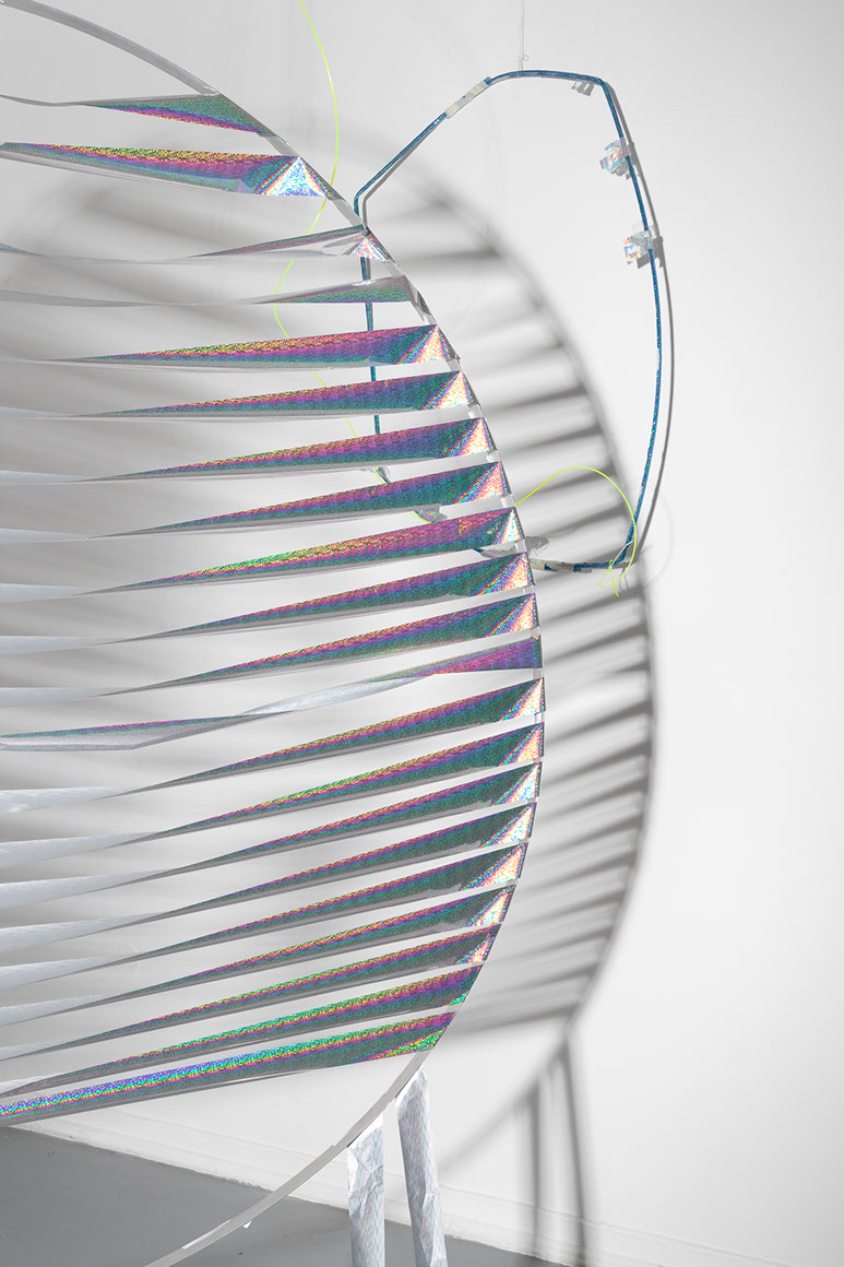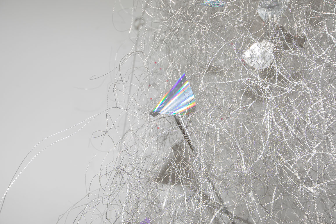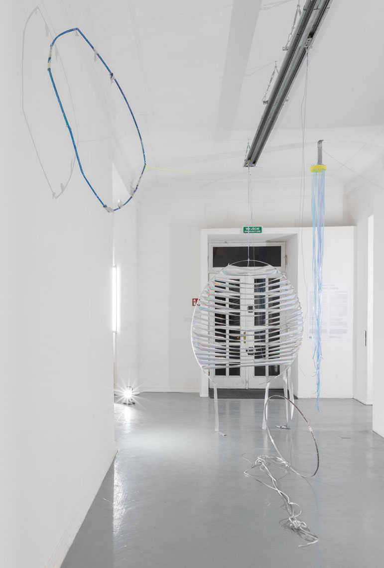 In the main hall, three mechanisms flicker in the light and make quiet sounds. Two of them are vortices — openwork objects revolving around their own axis — while the third, circular one, travels along the hall, referring to the daily path of the sun in the sky. Cyclicity and rotational movement as a universal force governing the world and the universe inspire the artist. The constant circulation of matter emphasises the use of found materials in the constructions. By juxtaposing them, the author does not avoid kitsch; she accentuates the ‘garage’ quality and the rawness of the creation.