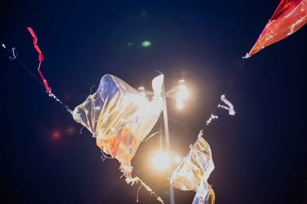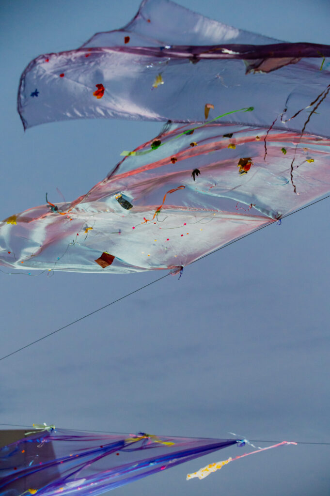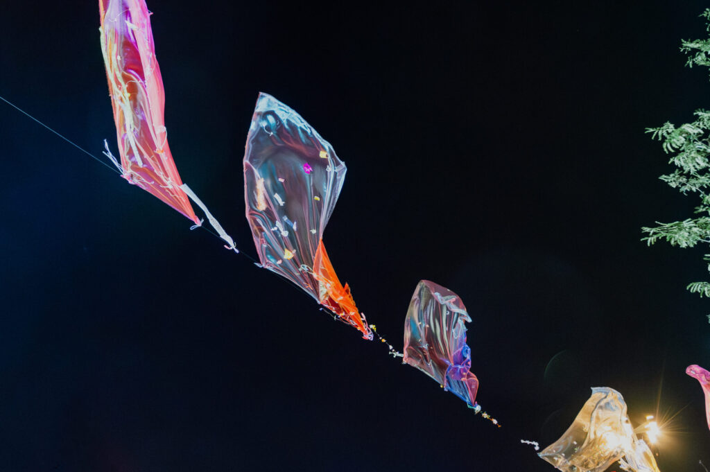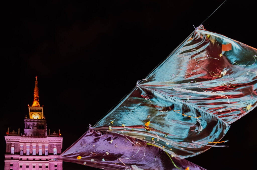 The set design for the Ball in the Square features thirteen fabrics suspended above the General Tribune in Warsaw’s Central Square. Spanning 30 metres across the square, the fabrics move gently in the air, shimmering with colour. The design draws inspiration from the polar lights—their fleeting nature, fluid movement, and luminous hues.