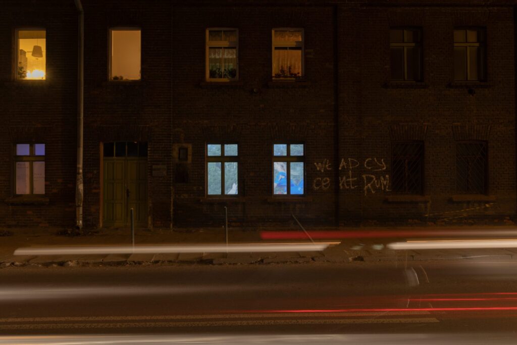 The gallery space is a two-room apartment from the early 20th century. One of the rooms is occupied by a projection of a semi-absurd dream; when viewed through the windows from outside, it appears as a passage to another dimension.