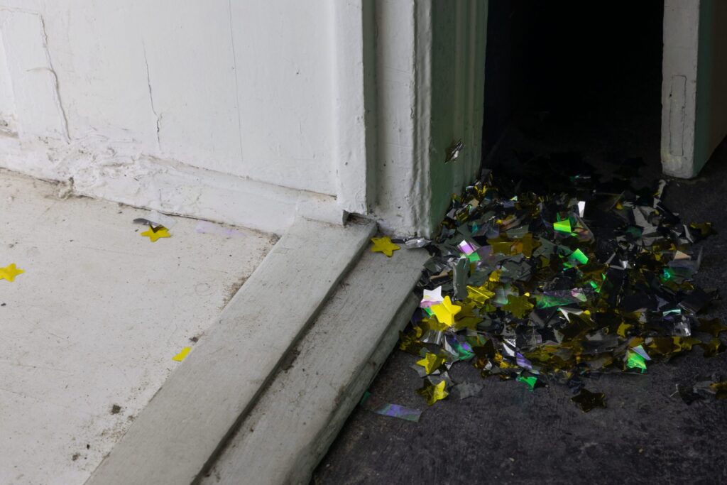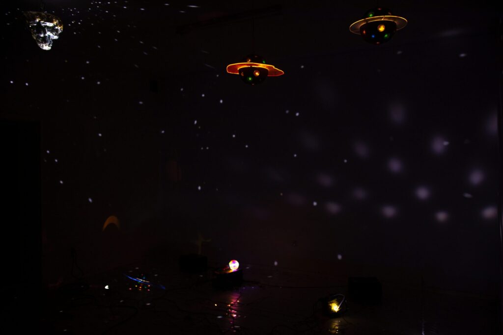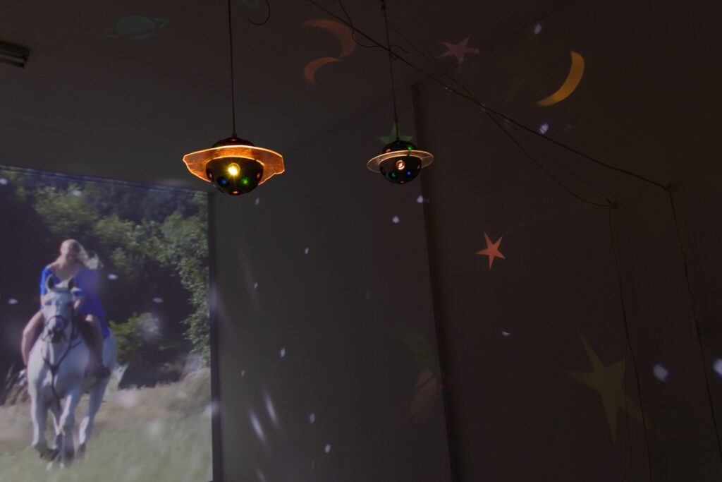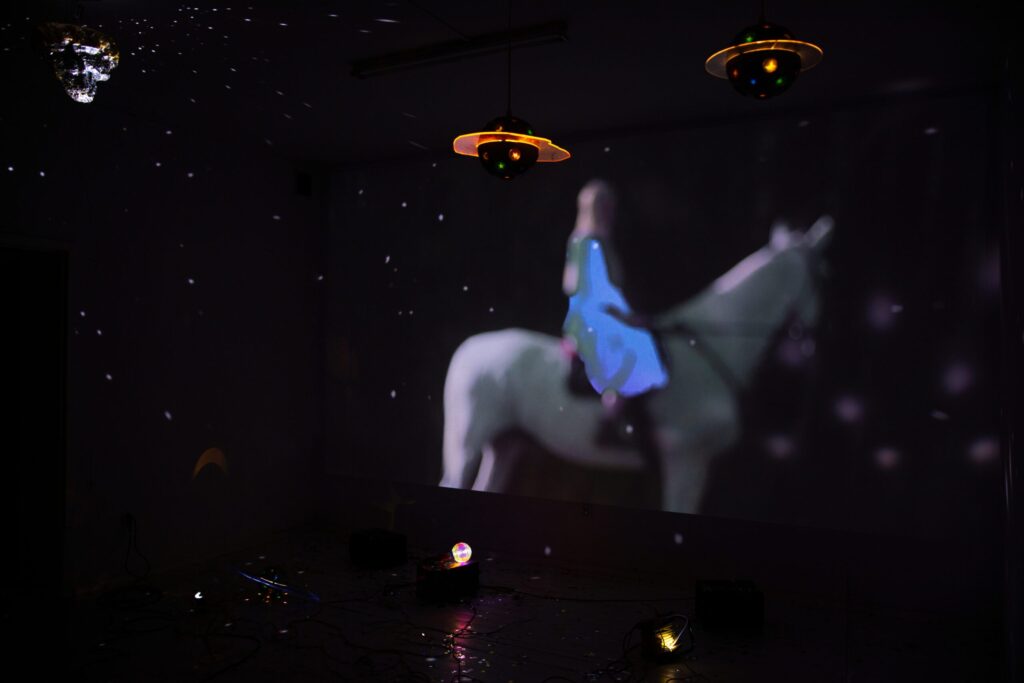 The video is accompanied by a post-produced mix of 1990s songs. Its climax unfolds through a progressively intensifying fragment of All by Myself, layered with a randomly edited image of a girl galloping on a horse. Her dress flashes through changing colors as the lights in the room blink in response to the song’s high notes, scattering sparkles that illuminate the space. Toward the end, the lamps themselves begin to move, echoing the spinning of the dress.