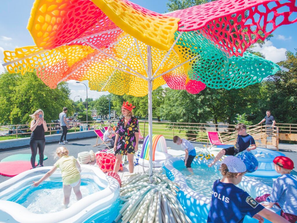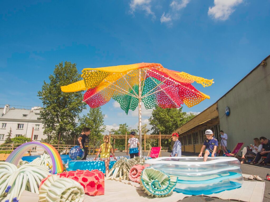 On Children’s Day, Marta Krześlak invites you to the Lagoon. The terrace of the Namysłowska Swimming Pool Complex, which is closed on a daily basis, will be open to regulars of the Namysłowska Bazaar. The stairs to the terrace are the only (usually closed) gate in the maze of wire mesh separating neighboring areas. What did Marta Krześlak build on the terrace? I know, but I won’t say – come and see for yourself. Preferably in flip-flops and a bathing suit.
