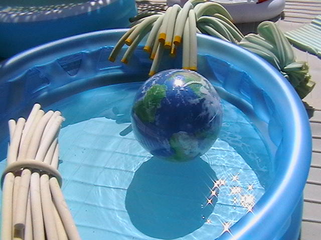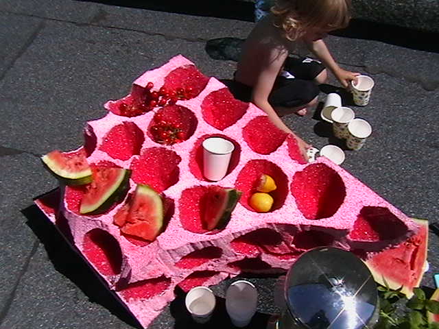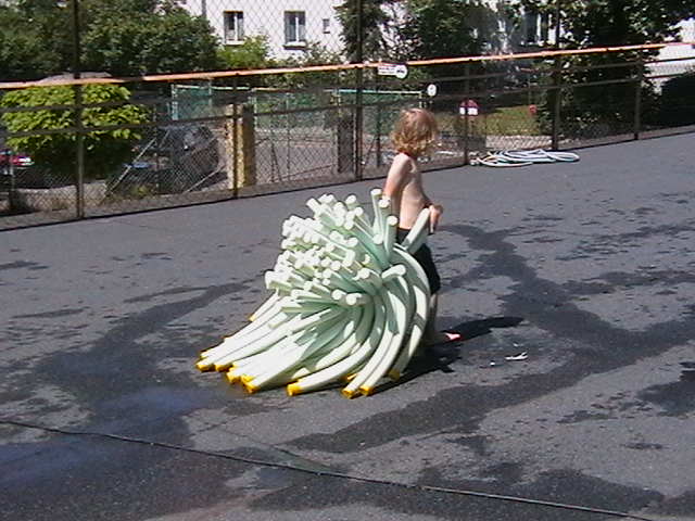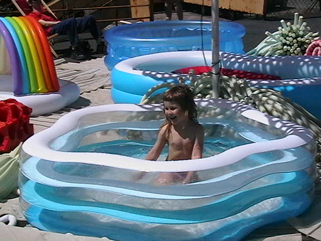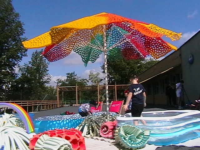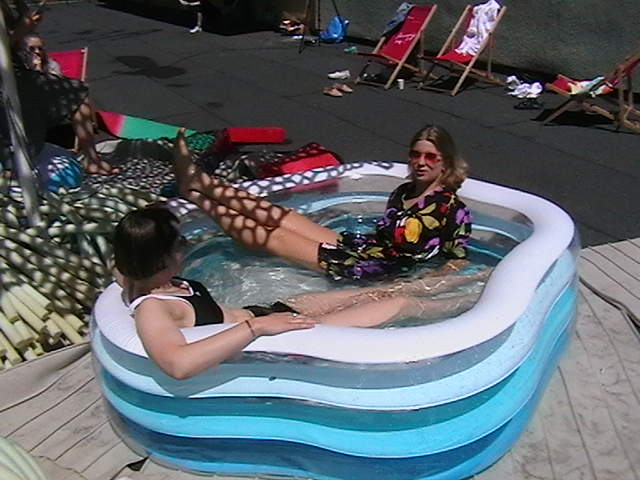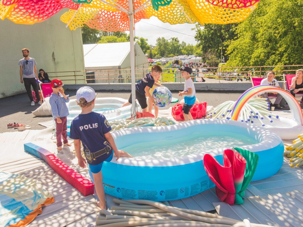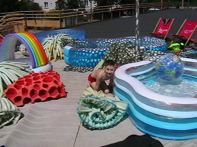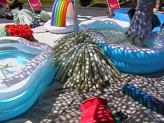 Scenographies from previous exhibitions, inflatable pools, food