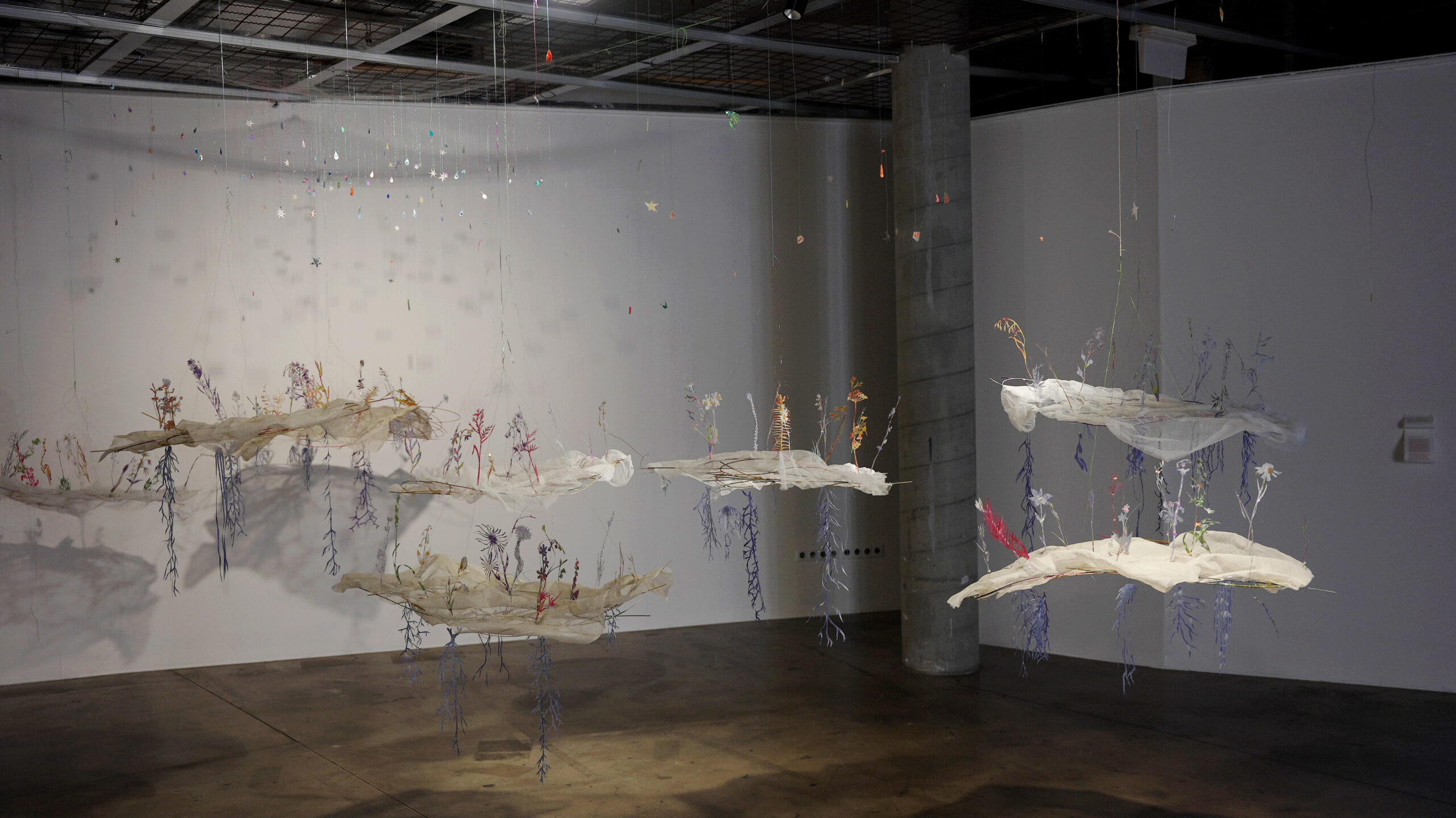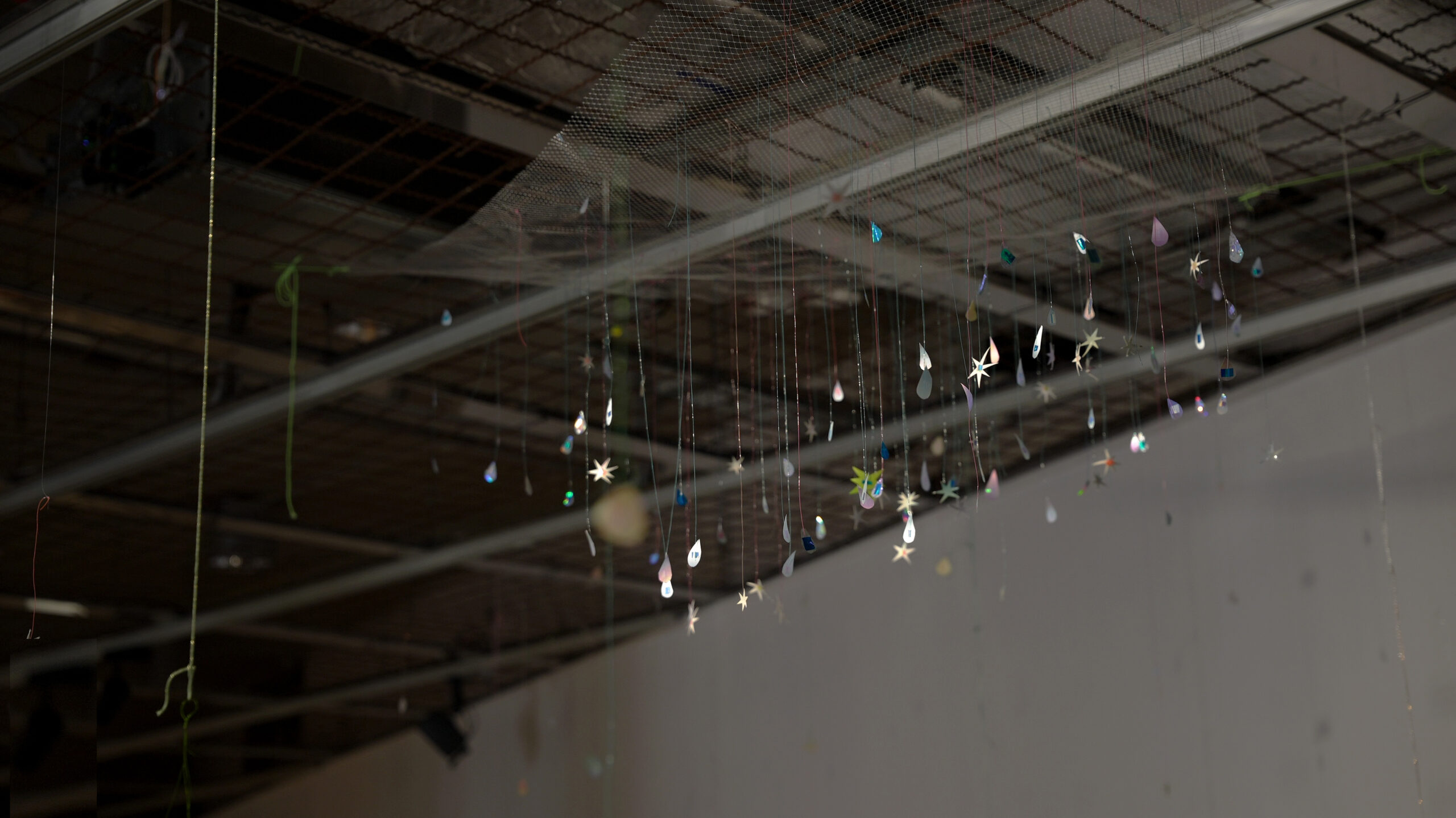 tracing paper, starched cotton, bamboo sticks, wire, iridescent tape / about 30m2