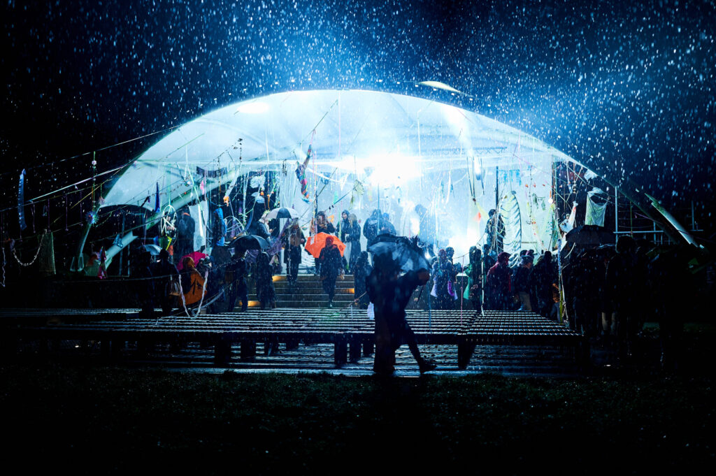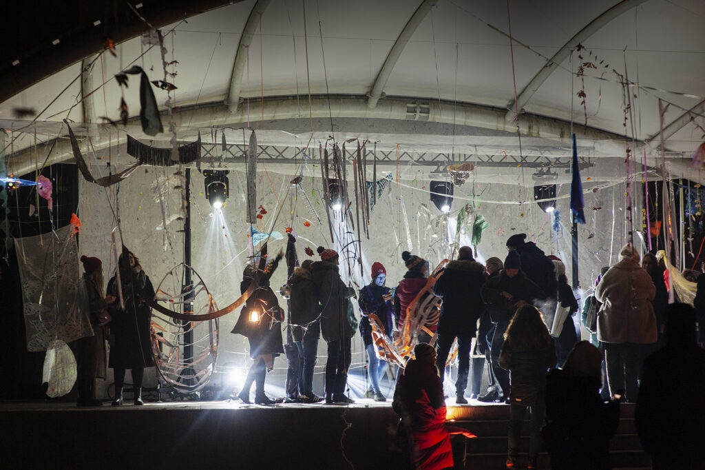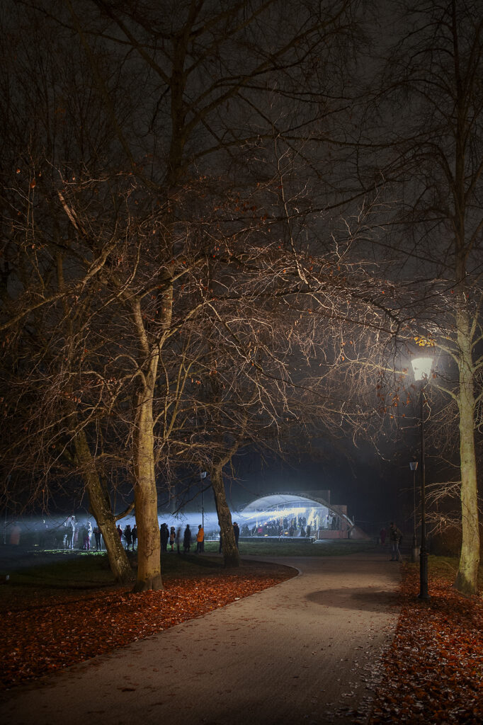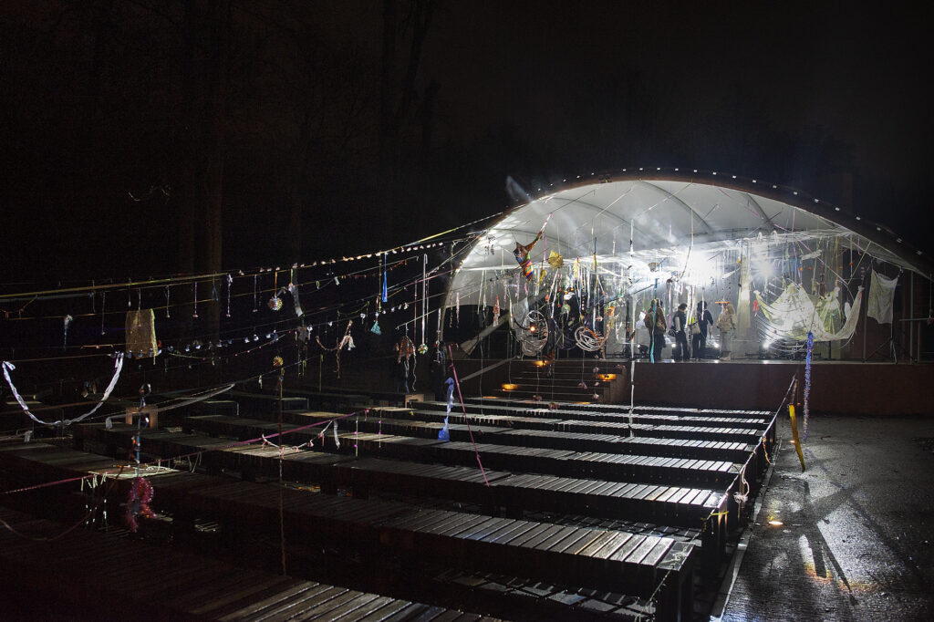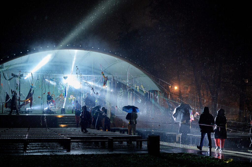 I use this tape in Memory of a Fair, hanging it, all torn, in Orunia’s concert shell. The installation is ethereal, with the ribbons extending far, to benches and trees – like trajectories of an explosion, a visual representation of thoughts, sun rays, obstacles to be passed, a tacky decoration or a collage of materials. Feel free to walk around them, lie on a bench or on the stage. I hope the festival nights are going to be windy, rainy, perhaps even snowy? In these circumstances, the elements of installation thrown onto the band shall and trees will provide the most sensations.