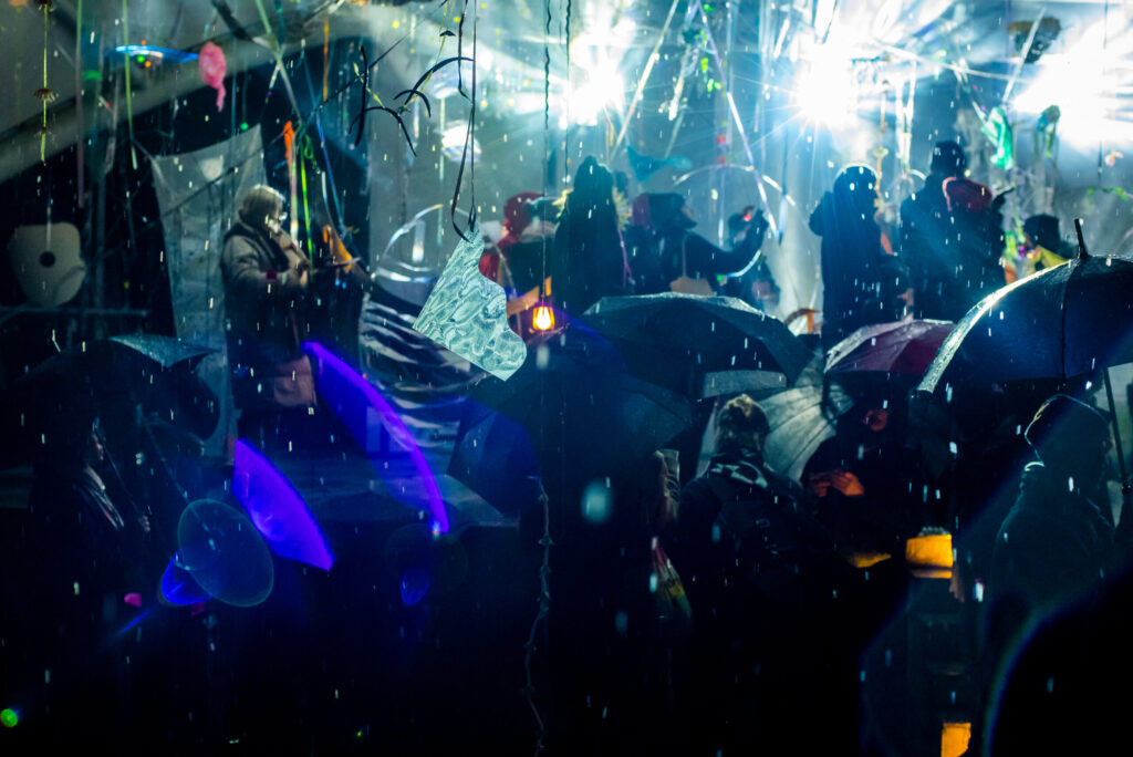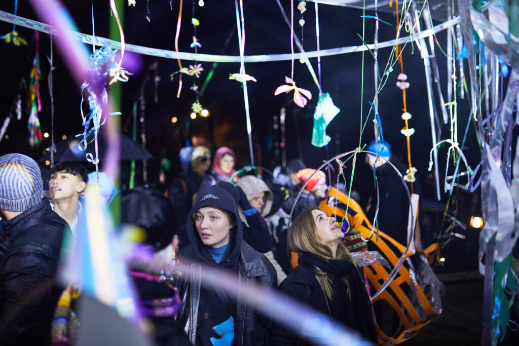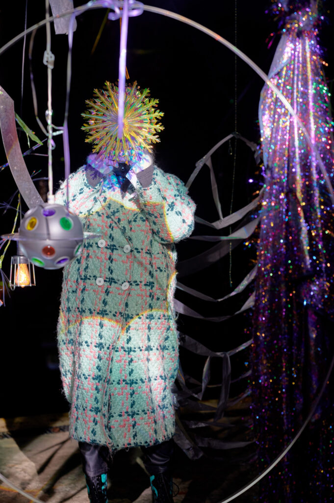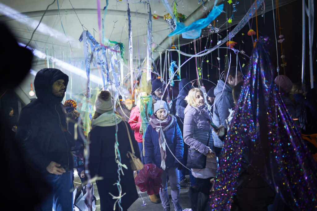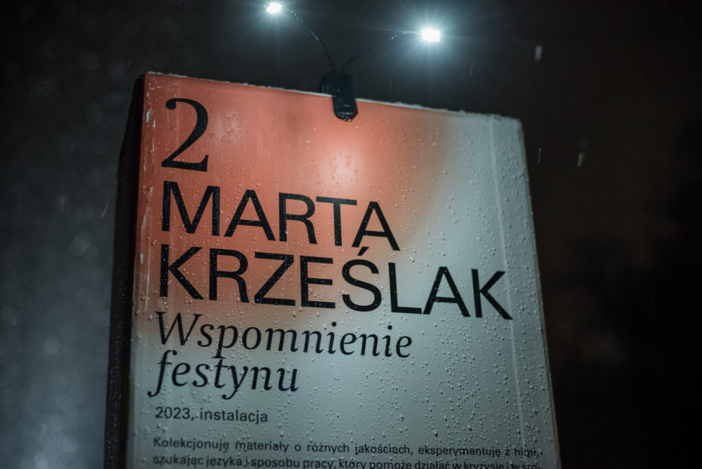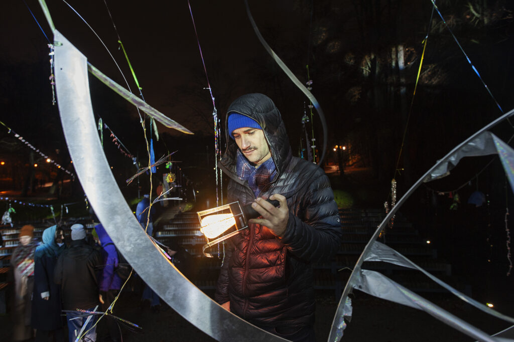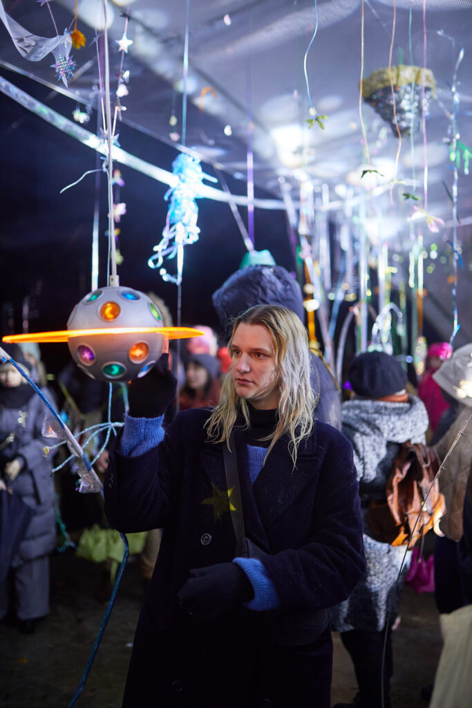 I collect materials of various textures and experiment with them, looking for a language and method of work that will help me act in a crisis and in unaltered surroundings. I constructed the festival installation using objects already in my possession. The primary criterion for selecting materials was their ability to reflect light.