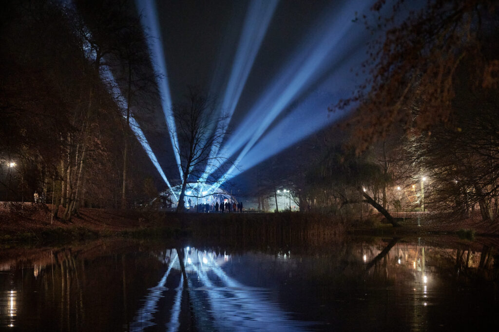 objects reflecting light suspended above the amphitheater, 8 pre-programmed mobile stage spotlights, 21 min audio