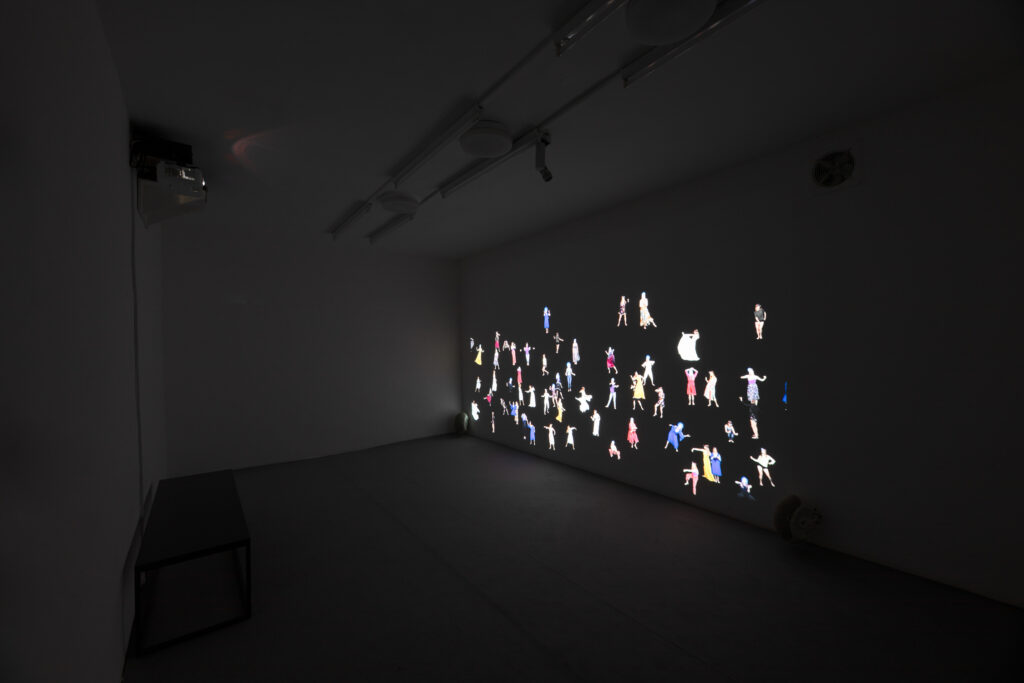 The looped poetic narrative in the accompanying projection gradually changes perspective from the scale of the universe, through the desert, to the artist’s home. Then her multiplied silhouette becomes a stellar constellation, to finally turn out to be the morning dew. The projection is accompanied by a soundtrack topped, perversely, by the song ‘My Heart Will Go On’. The film can be interpreted in many ways: symbolically, pop-culturally, nostalgically or purely aesthetically.