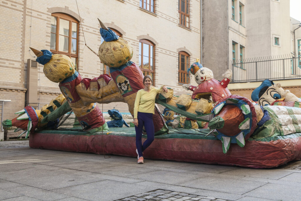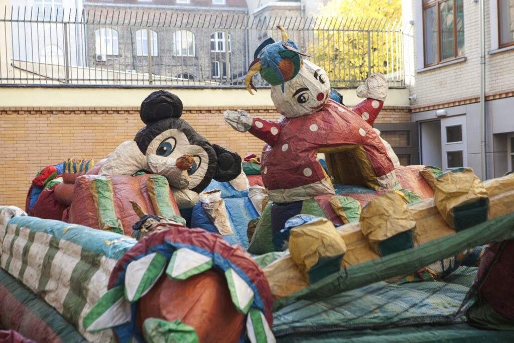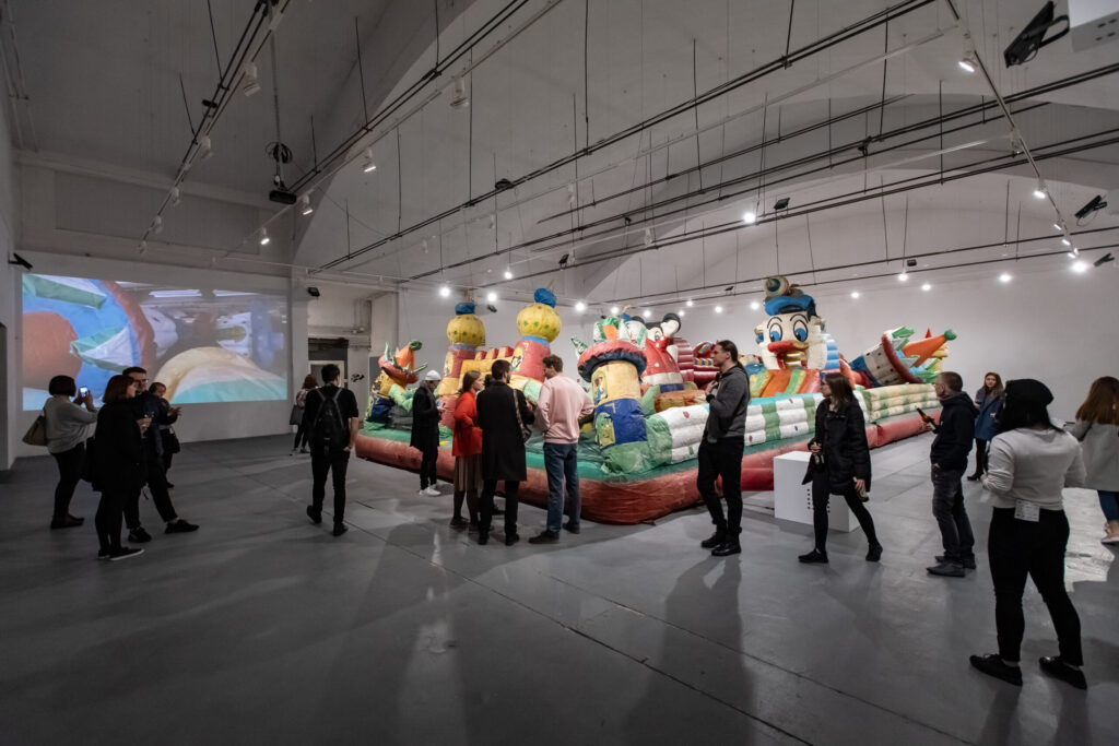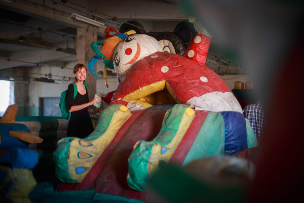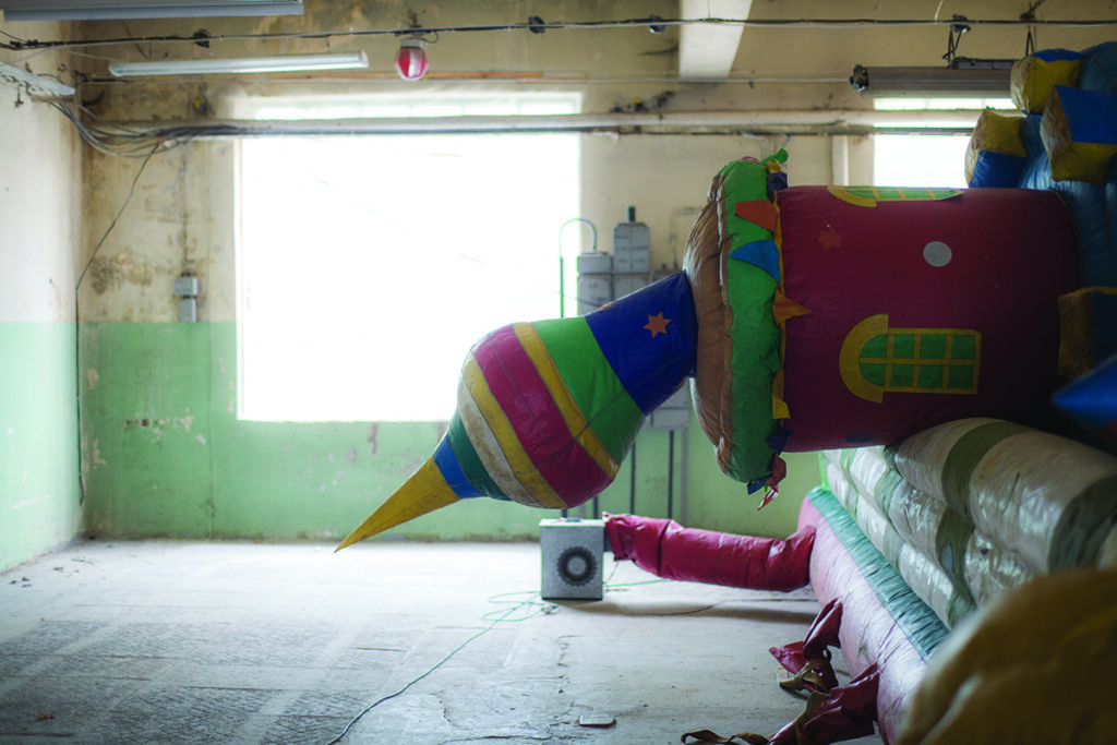 The ruins of my dreams is an unnecessary object turned into a sentimental landscape. I try to detach it from its remembered utility and give it a poetic function. I am interested in the aesthetics of plastic, inflatable castles and the absurdity of their indestructibility. I inflate a huge found castle like a fantastic dream and I invite you to walk on its surface. The waving giant is accompanied by pop, love songs from the 90s, sung by me and processed in post-production.