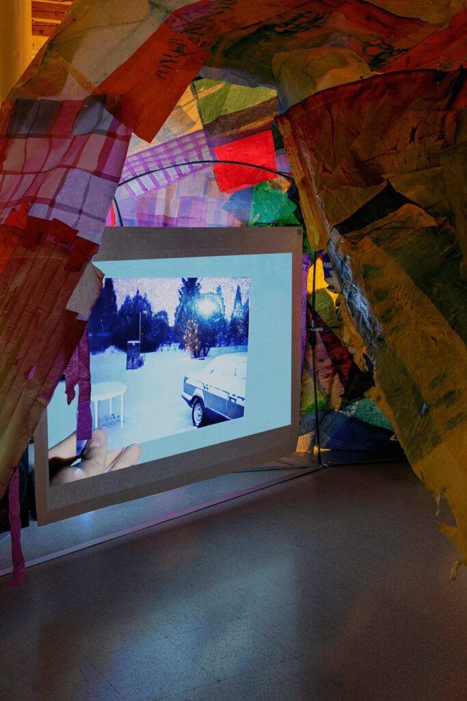 A tent made of stitched paper. It becomes many things at once: a meadow caught in a storm, a star-filled sky, a hollow mountain, a hill to lie upon, a shelter for tears, and a lullaby to hum. Inside the tent, I project an image onto checkered paper—an afterimage, where one thing begins to resemble another. The transparency of the paper allows colours to blend and overlap, evoking the way memories are formed: images recalled, layered, and recomposed into a new story.